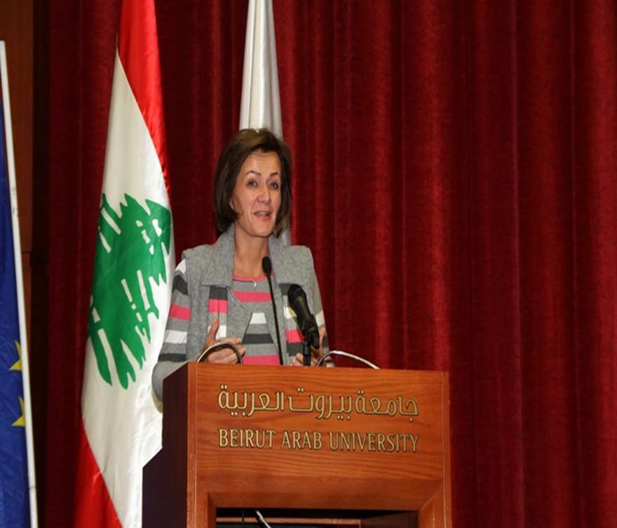 Mrs. Angelina Ekhorest, European Union Ambassador, addressed the students, reminding the audience that Lebanon is an important partner to the EU, not only in terms of dealing with the Syrian crisis, but also in terms of human rights. This is manifest in the effectiveness of parliamentary elections and structural reforms in the economic and social sectors.