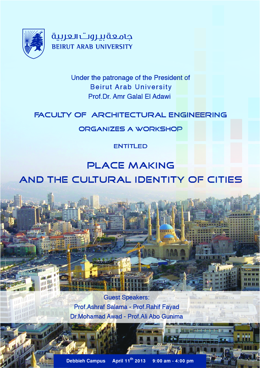 11 April 2013The Faculty of Architectural Engineering at Beirut Arab University will be holding a symposium under the title of “ Place Making and Cultural Identity of Cities” . This Symposium will be held for the occasion of the Golden Jubilee of the Faculty and will take place on the 11th of April 2013 at Debbieh Site.