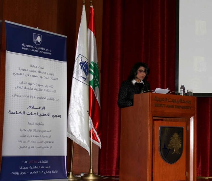 18 March 2014The relationship between the people with special needs and the media, the role of the media in integrating these people in the public life, and their depiction in the media were the main topics of the Discussion Panel organized by the Faculty of Arts at Beirut Arab University, entitled “Media and People with Special Needs”. The event which was held on the 18th of March, 2014 at the Main Campus in Beirut, hosted Attorney Mr. Nizar Saghieh, the Journalists Mrs. Diana Moukalled, Mr. Imad Raef and Mr. Fadi El Halaby.