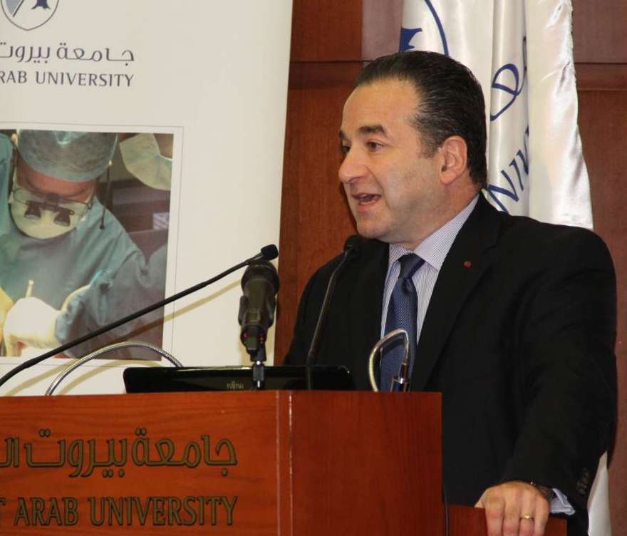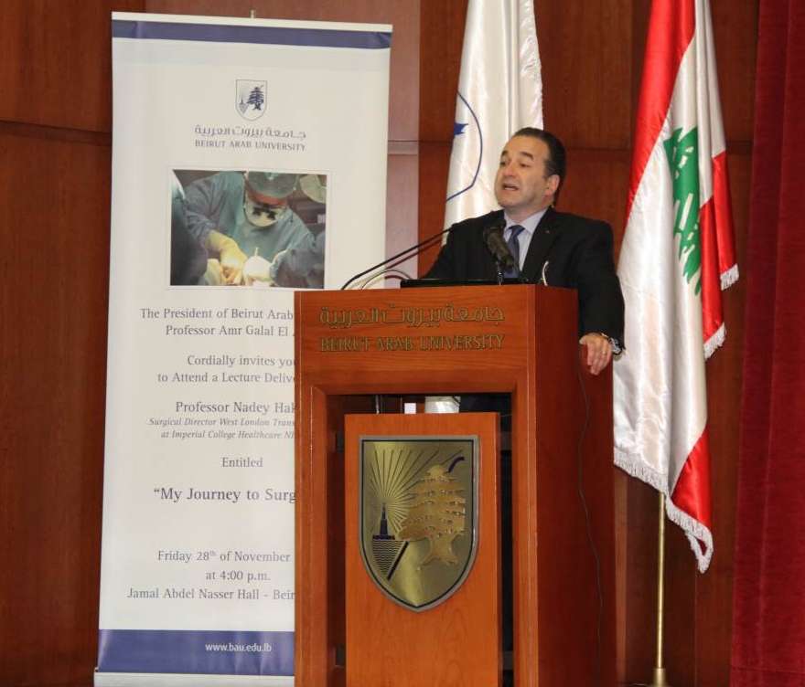 28 November 2014Beirut Arab University hosted Prof. Nadey Hakim, Surgical Director of the West London Transplant Unit at Imperial College, Healthcare NHS Trust, and Governor of the American College of Surgeons, for a lecture entitled “My Journey to Surgery”. The event that was held on the 28th of November, 2014 at Jamal Abdel Nasser Hall- Beirut Premises demonstrated the significant moments in Prof. Hakim’s professional, practical and personal life, in addition to the most prominent successes he made internationally as a physician of Lebanese origins. He elaborated on how he had succeeded in joining the most prestigious medical edifices around the world, where he had conducted the most important and delicate surgeries that changed the lives of his patients, taking them from despair to a new lease on life.