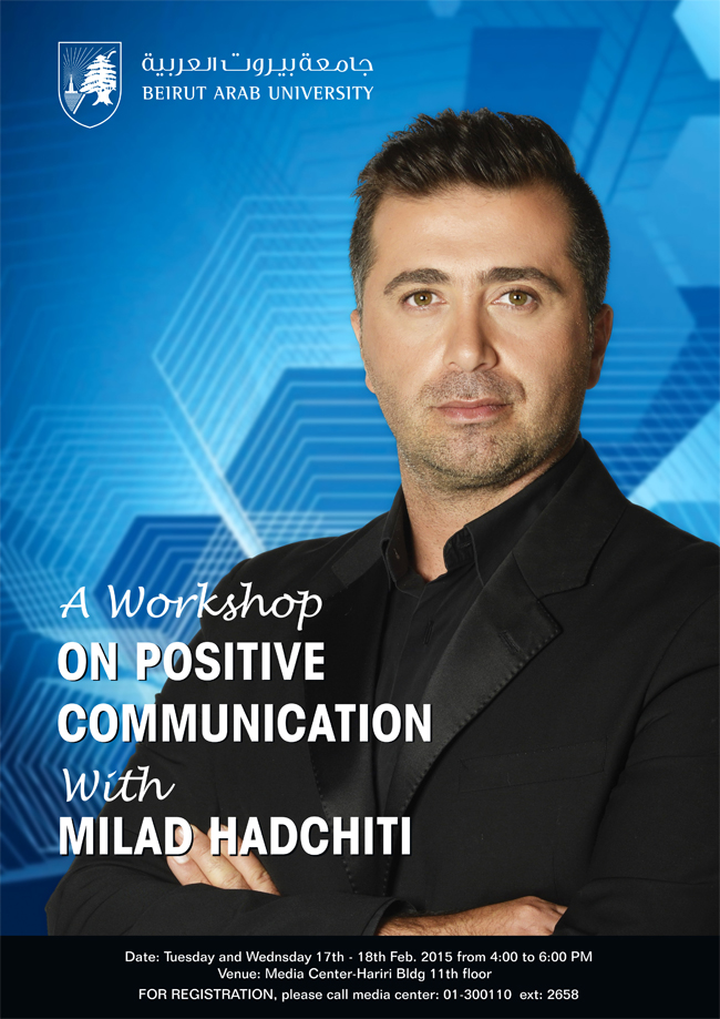17 February 2015The Public Relations Department at Beirut Arab University will be holding a workshop for the Journalist Milad Hadchiti under the title of “Positive Communication”. The workshop will take place on Tuesday and Wednesday 17 & 18 February, 2015 from 4:00 P.M to 6:00 P.M. at the Media Center – Hariri Building, 11th Floor- Beirut Campus.