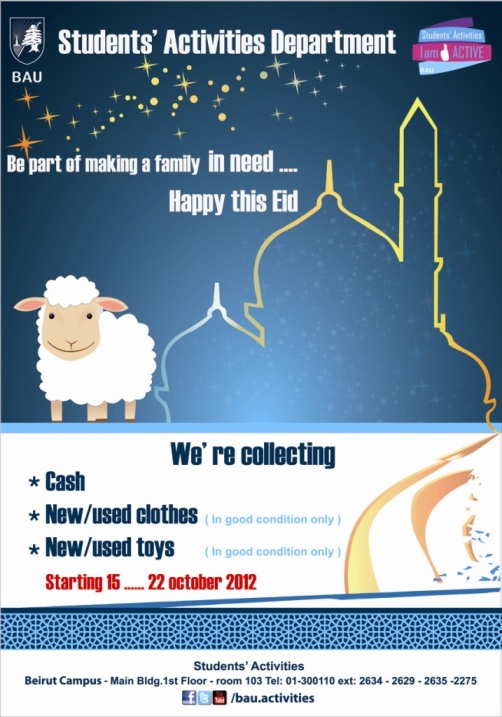 17 October 2012The Students’ Activities Department will be organizing the charitable event “Be part of making a family in need… Happy this Eid!” on the 17th of October 2012, at Debbieh Site.