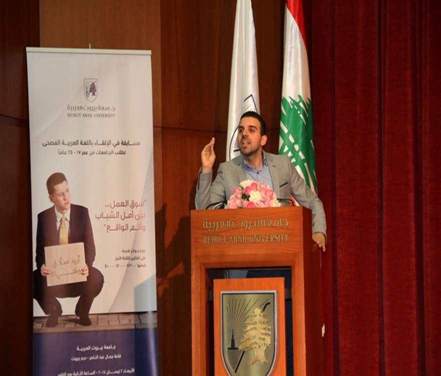 02 April 2014Unemployment, the problems of the job-market, and the concerns of Lebanese students and youth, were some of the prominent topics at the Arabic Recitation Contest organized by Beirut Arab University for the seventh consecutive year. The Contest was entitled “The Job-Market: The Hopes of Youth and the Pains of Reality”, and was held at Beirut campus on the 2nd of April, 2014. The event hosted eighteen contestants from 10 Lebanese universities: Beirut Arab University, the Lebanese University, the Antoinine University, the Balamand University, Notre-Dame University, the Holy Spirit University of Kaslik, St. Joseph University, Al- Jinan University and Sagesse University. The aim was to encourage students to use Arabic as a mother language, both in writing and in speech.