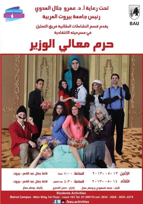 The Drama Club at the Students’ Activities Department at Beirut Arab University will be presenting its Play “The Spouse of the Minister” at Jamal Abdel Nasser Hall – Beirut Site on 13th -14th of May, 2013 at 7:00 P.M. .