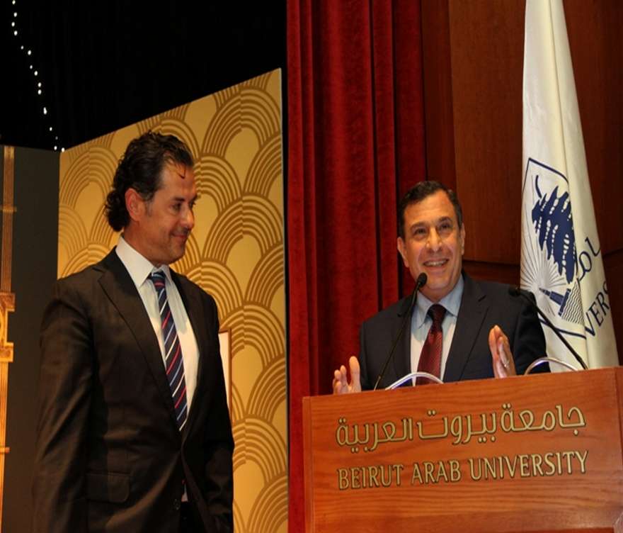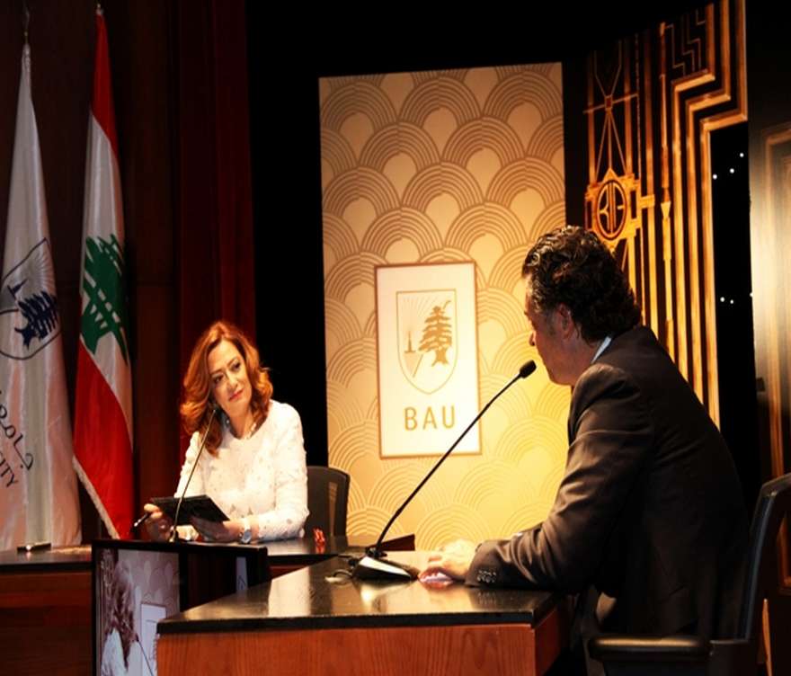 The event which was held on the 8th of May, 2014 at Jamal Abdul Nasser Hall , Beirut Campus, was attended by MP Dr. Ammar Houri, Mrs. Margaret El Helou, Director of the UN Office, Prof. Dr. Amr Galal El Adawi, President of BAU, Mr. Issam Houri, BAU Secretary General, , in addition to the deans of faculties, staff-members, BAU Directors, students, graduates and administrative staff. Taking the form of an interview conducted by Mrs. Zina Ariss, Director of Public Relations Administration at the University, Alama was introduced as a landmark and universal artist, whose voice has charmed the young and the old. He has sung of love, life and the fatherland, nimbly roving between words and melodies. Similarly, his songs have reached the far corners of the world, establishing the aspirations of an ambitious artist who knows no limits, spreading love from Beirut to the world”.