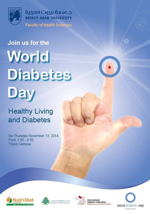 Under the title of “Healthy Living and Diabetes” , and for the occasion of the World Diabetes Day, the Faculty of Heath Sciences at Beirut Arab University – Tripoli Campus will be celebrating this day by a series of activities on the 13th of November, 2014 from 1:00 P.M. till 4:30 P.M.