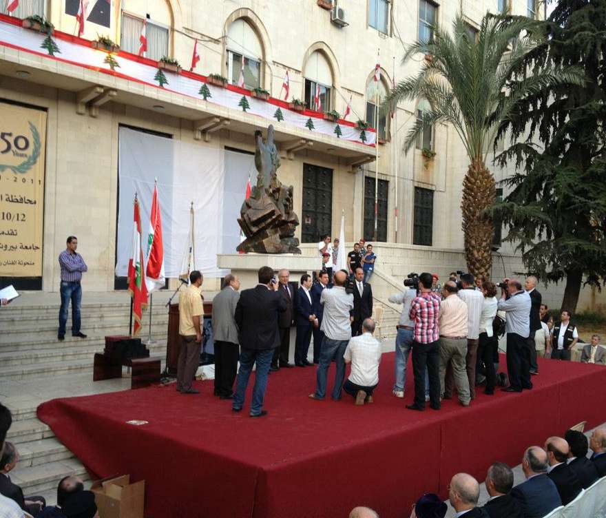 Under the auspices of the Lebanese President, General Michel Souleiman represented by Minister Wael Abu Faour, Zahlé celebrated on Saturday, 13th October 2012, upon an invitation by the Governor of Bekaa, Judge Antoine Sleiman, the unveiling of its 150th jubilee monument, considered to be the first constant reminder created by Roudy Rahme and presented by BAU.