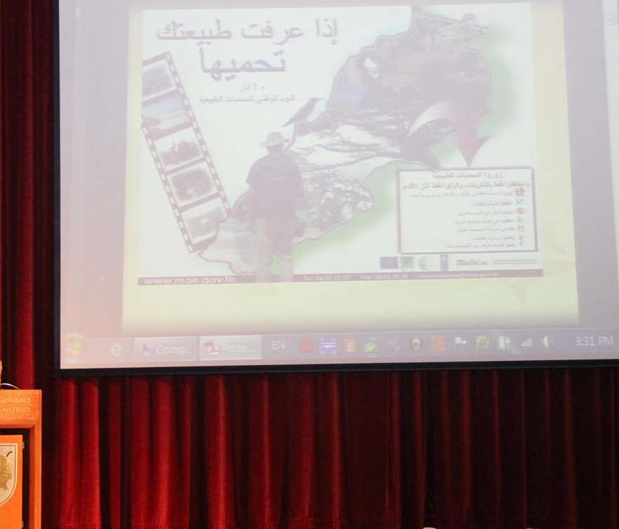 The ceremony closed with the President granting the Minister an honorary shield in appreciation of the latter’s diverse contributions to the preservation of the environment. The signing ceremony was followed by a workshop entitled “The Importance of the Collaboration between the Ministry of the Environment and Researchers to Preserve the Environment in Lebanon”. The workshop witnessed a number of interventions by representatives of the Ministry projects, which highlighted various topics such as the powers of the Ministry, means to treat hard wastes and regaining energy. It also explored issues relevant to the ecological impact, renewable energy and nature reserves.