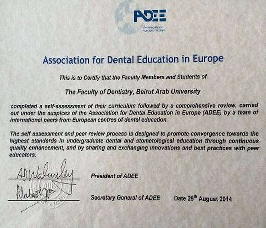The International Association for Dental Education in Europe (ADEE) declared that the Dentistry Program at BAU compares favorably with that of European schools and institutions. In a letter addressed to the President of BAU Prof. Amr Galal El- Adawi, the Association stated that the visiting ADEE delegation expressed their admiration of the current academic and administrative structures at the University at large, as well as recent developments and the infrastructure introduced at the Faculty of Dentistry in particular.