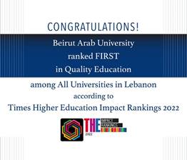 BAU Ranked First in Lebanon on Quality Education in THE Impact Rankings 2022