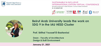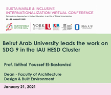 The conference was organized by York University – Canada, in partnership with the IAU, Okayama University – Japan, and Canadian Commission for Unesco. The conference took place on 20-22 January 2021, while the Networking Session that has been hosted by the IAU was on 21 January 2021. In her presentation, Prof. El-Bastawissi focused on achieving the SDG goals generally and SDG9 particularly through education, research, conferences, new labs, innovation and community-based projects as well as wide-spreading BAU Journals, and developing partnerships with other universities.
