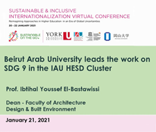 The conference was organized by York University – Canada, in partnership with the IAU, Okayama University – Japan, and Canadian Commission for Unesco. The conference took place on 20-22 January 2021, while the Networking Session that has been hosted by the IAU was on 21 January 2021. In her presentation, Prof. El-Bastawissi focused on achieving the SDG goals generally and SDG9 particularly through education, research, conferences, new labs, innovation and community-based projects as well as wide-spreading BAU Journals, and developing partnerships with other universities.