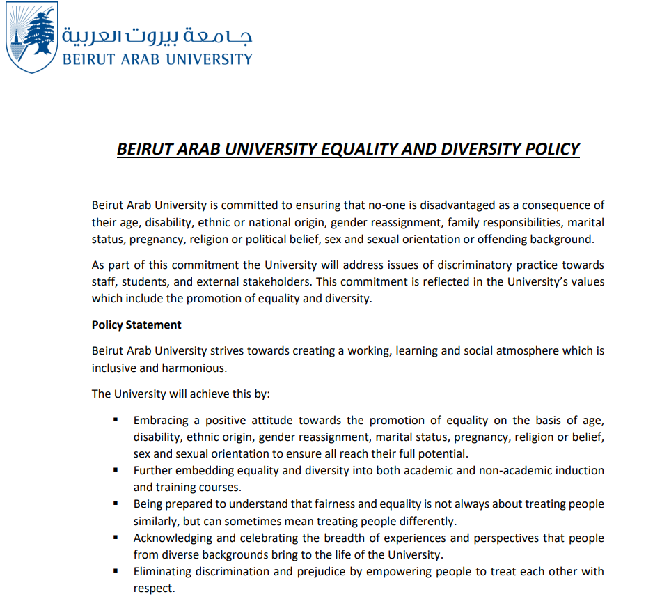 Beirut Arab University is committed to ensuring that no-one is disadvantaged as a consequence of their age, disability, ethnic or national origin, gender reassignment, family responsibilities, marital status, pregnancy, religion or political belief, sex and sexual orientation or offending background.